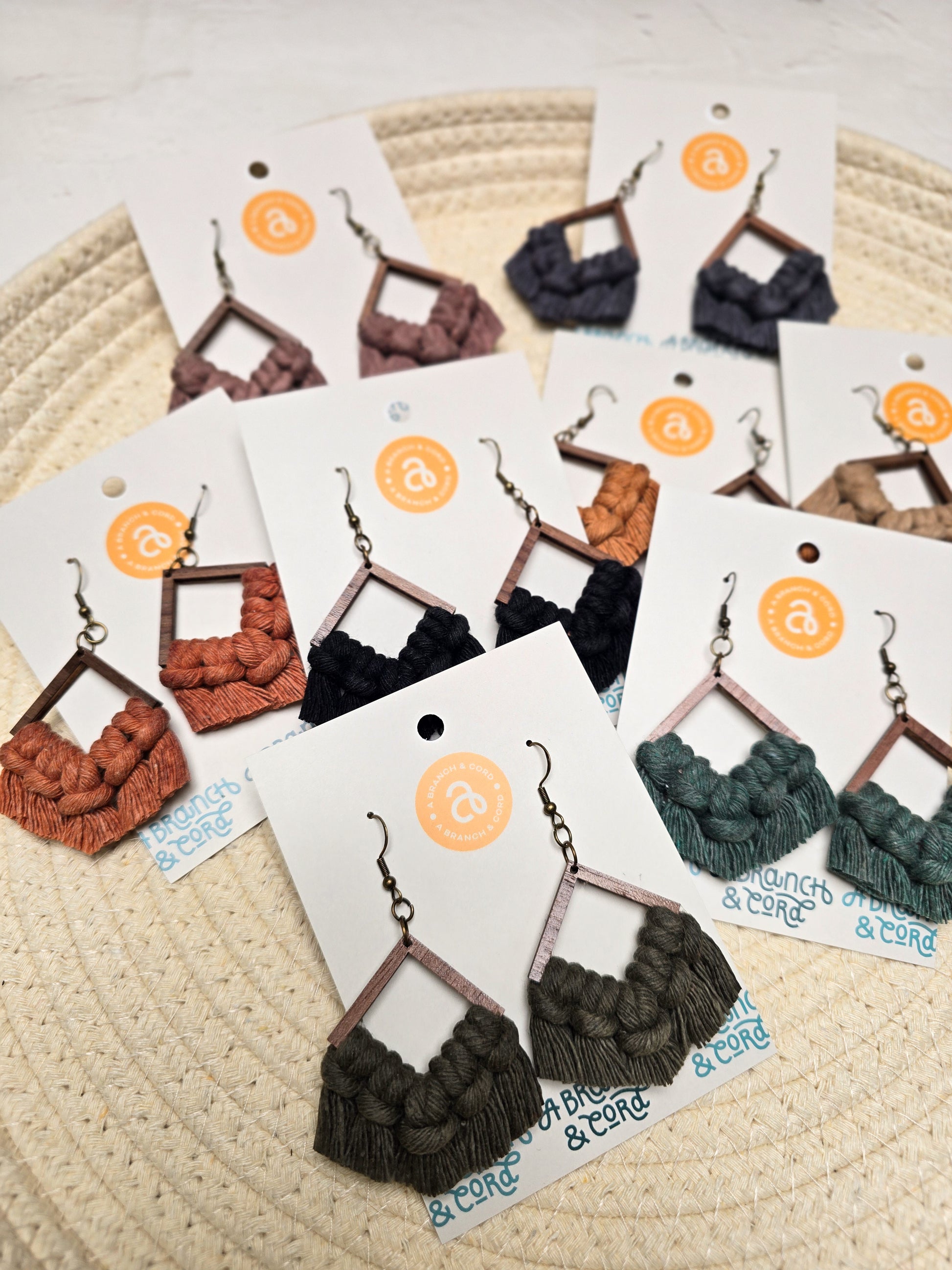 Handmade with 100% cotton cord, wooden earring blanks, and bronze, hypoallergenic earring hooks.